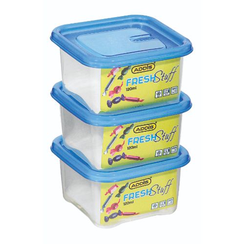 Whether you're packing sauces, spices, or little snacks, the Addis Fresh Stuff 120ml 3pc Square Set fits perfectly into any kitchen routine. These clear containers with their signature blue lids keep freshness locked in and clutter out—made for your home by West Pack.